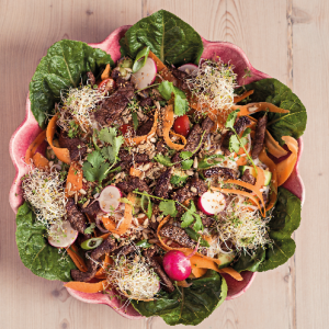 6. Klipp över krasse och strö på alfalfagroddarna. Lägg köttet på salladen. Strö över fröna och servera dressingen vid sidan om tillsammans med några limeklyftor.