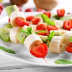 Skär frukten i jämna bitar och trä på spett. Dela limen på mitten. Grilla spetten ca 2 minuter per sida. Grilla limen med köttsidan ner lika länge som spetten.