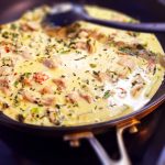 Fräs kycklingen i smör på hög värme, så den får en fin gyllene färg. Tillsätt salladslök, chili, ramslök och zucchini och fräs i ca 2 minuter.