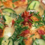 Skär gurkan i skivor och halvera dem. Strimla baconet och stek det knaprigt. Låt det rinna av. Rör ner gurkan i såsen vid servering och strö över baconet. Servera med ris eller pressad potatis.